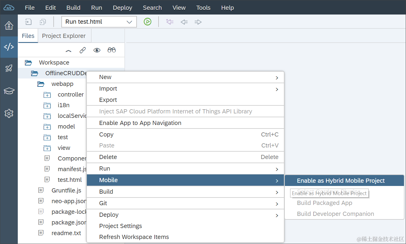 选择WebIDE里的Master-Detail应用文件夹,右键菜单里选择Mobile->Enable as Hybrid Mobile Project: