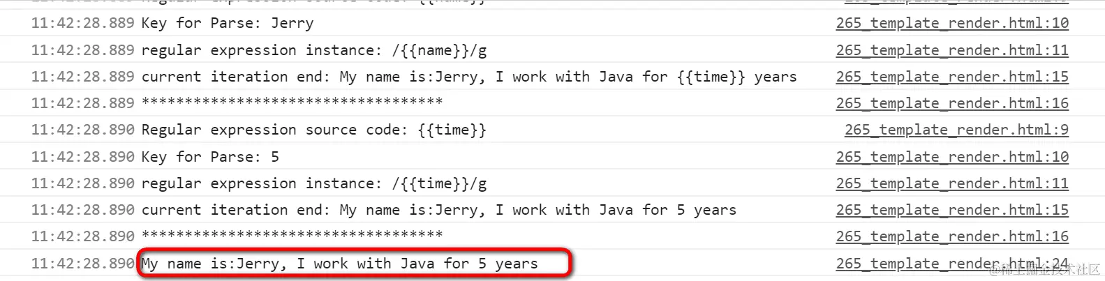 const str = "My name is:{{name}}, I work with Java for {{time}} years";