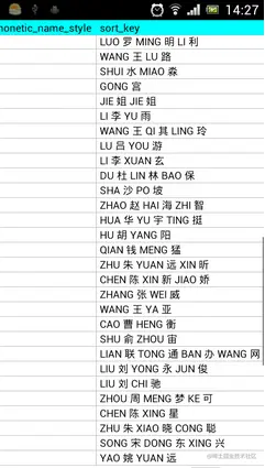 可以看到,这一列非常人性化地帮我们记录了汉字所对应的拼音,这样我们就可以通过这一列的值轻松为联系人进行排序了。