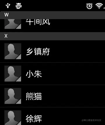 可以看到,在 onCreate 方法中,我们从系统联系人数据库中去查询联系人的姓名和排序键,之后将查询返回的 cursor 直接传入 AlphabetIndexer 作为第一个参数。由于我们一共就查了两列,排序键在第二列,所以我们第二个 sortedColumnIndex 参数传入 1。第三个 alphabet 参数这里传入了 "#ABCDEFGHIJKLMNOPQRSTUVWXYZ" 字符串,因为可能有些联系人的姓名不在字母表范围内,我们统一用 #来表示这部分联系人。