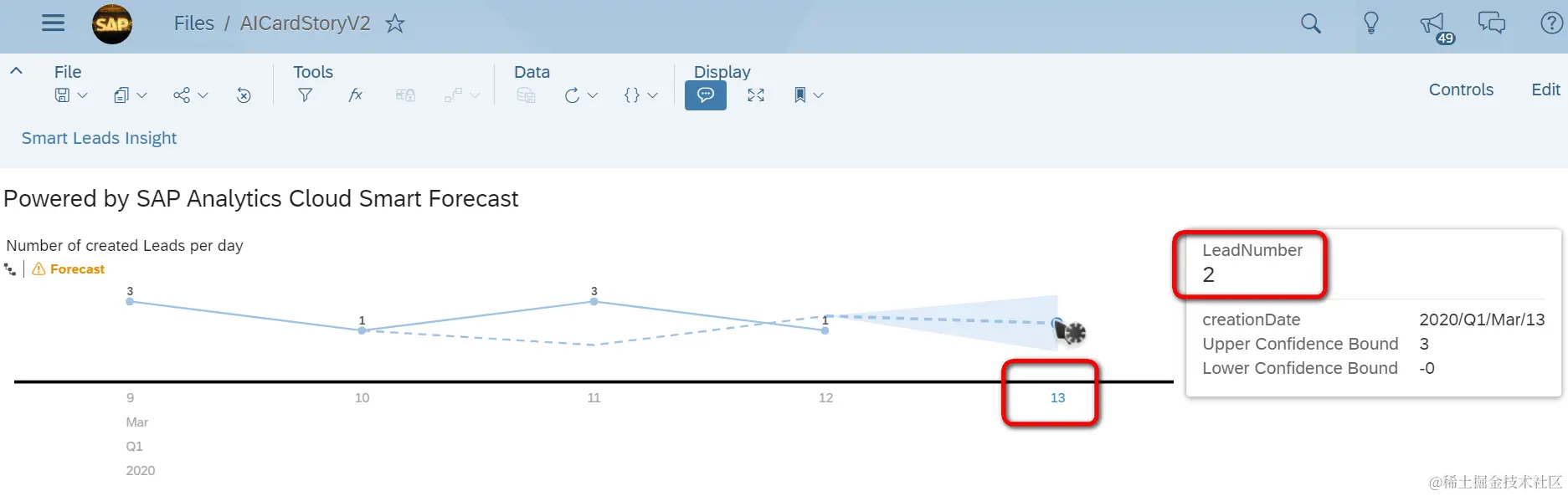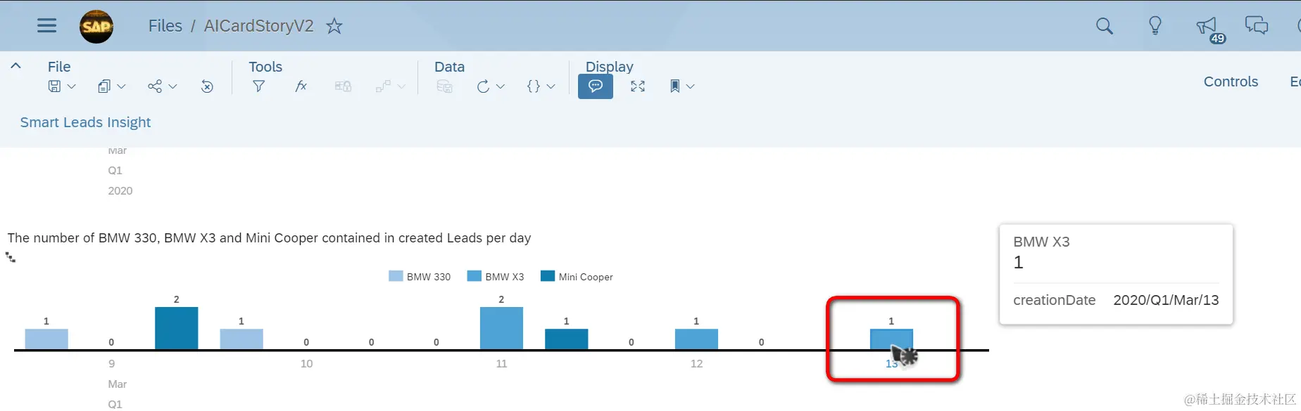 再打开基于这个model创建的story,其中Bar chart里显示的数据已经自动刷新了,我已经能够看到3月13日的数据了: