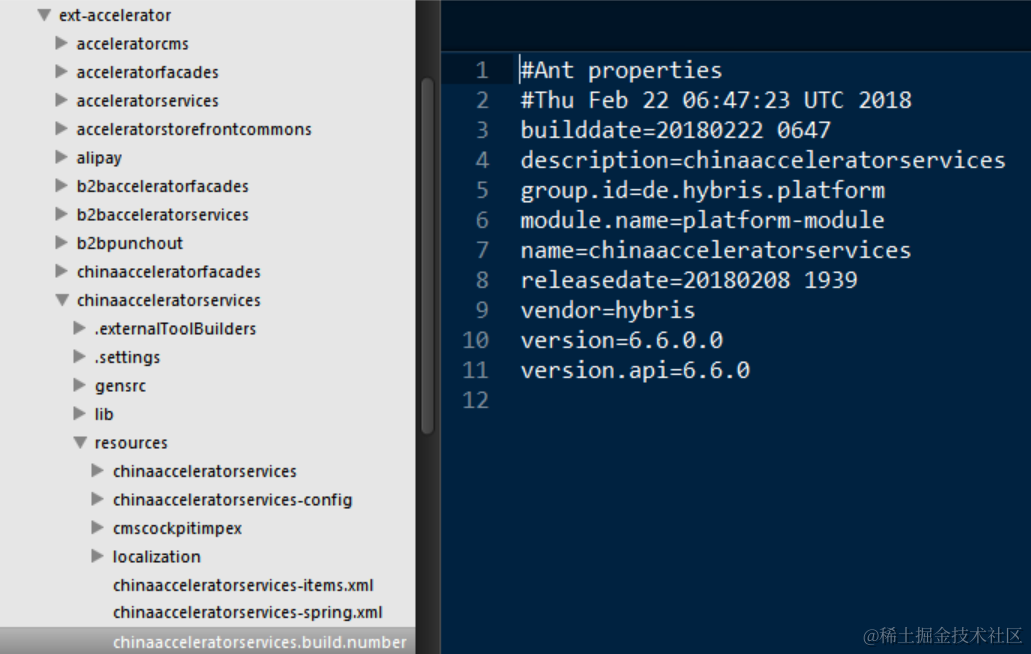 In addition, every SAP Commerce package contains a <build.number> file with no prefix. This package-related build.number file contains the same information as the <$extension>.<build.number> files, but also has a list of the extensions contained by the package.