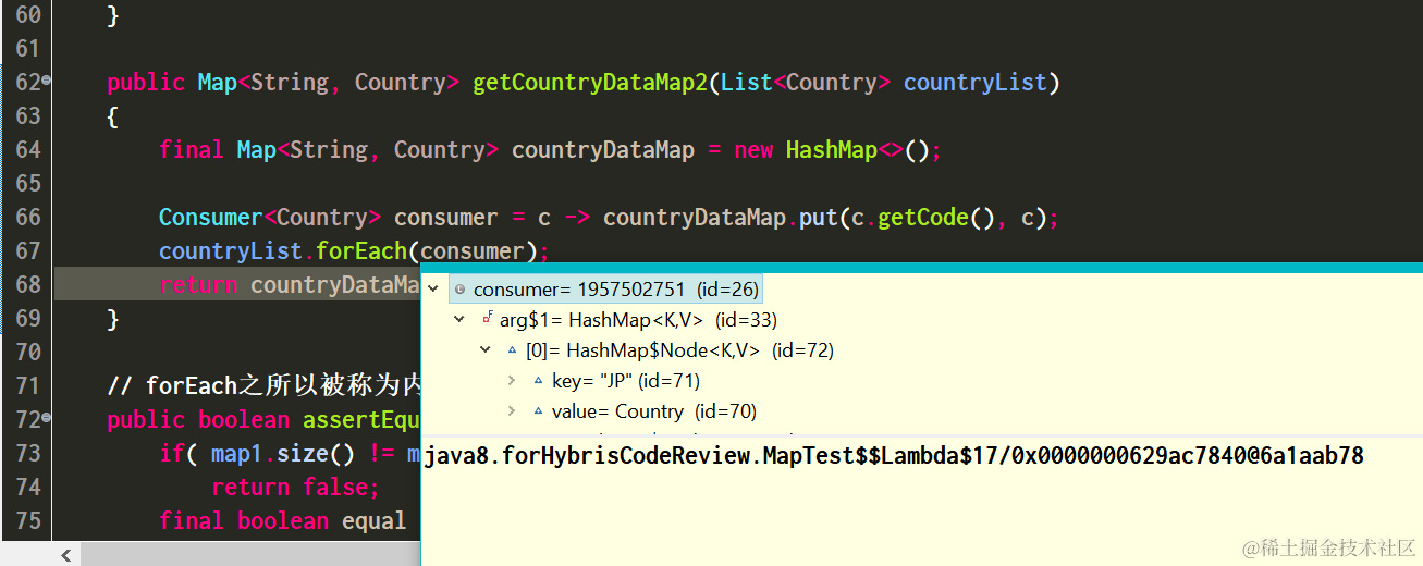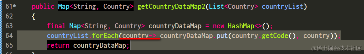 country为临时变量,类型为countryList里的元素,forEach里的Consumer实际是一个Lambda Function,并且可以访问函数体外定义的变量。