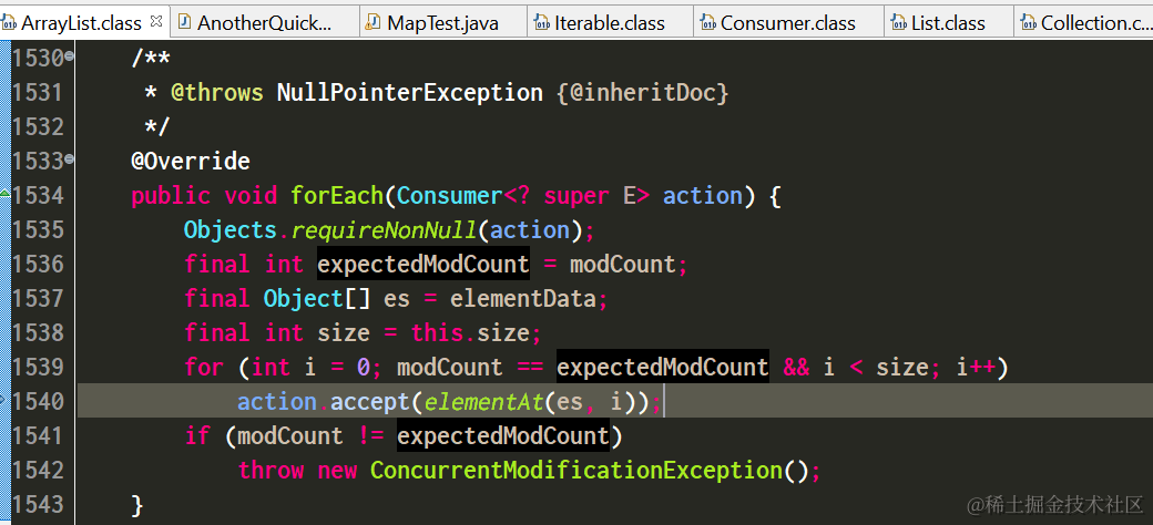 实际上内部还是存在一个for循环,如1539行所示,遍历集合每个元素,依次调用action的accept方法: