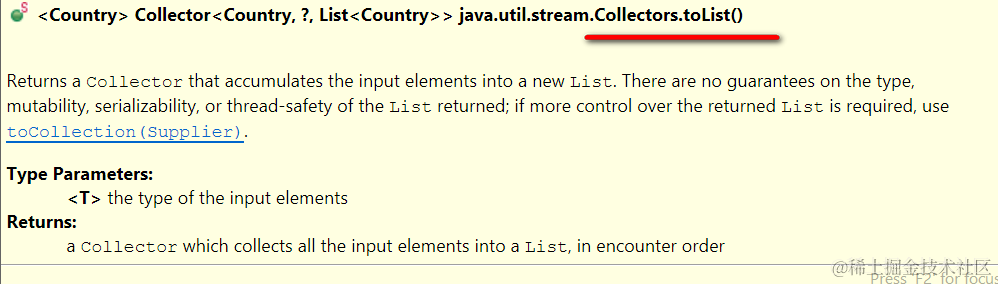 Returns a Collector that accumulates the input elements into a new List. There are no guarantees on the type, mutability, serializability, or thread-safety of the List returned