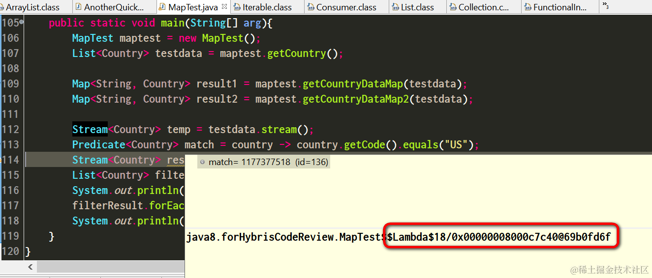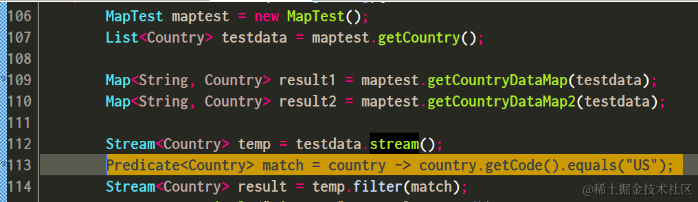 因此代码里我就可以使用第113行这种箭头函数,country为箭头函数或者说Lambda Function里的形式参数(输入参数),因为Predicate接收的泛型参数为T- Country,所以编译器能断定,形式参数的类型一定为Country.