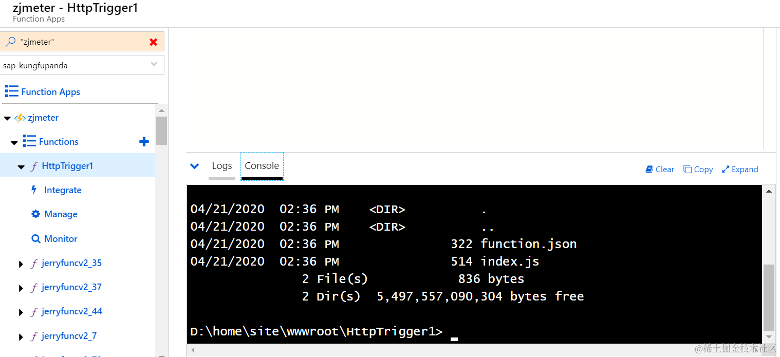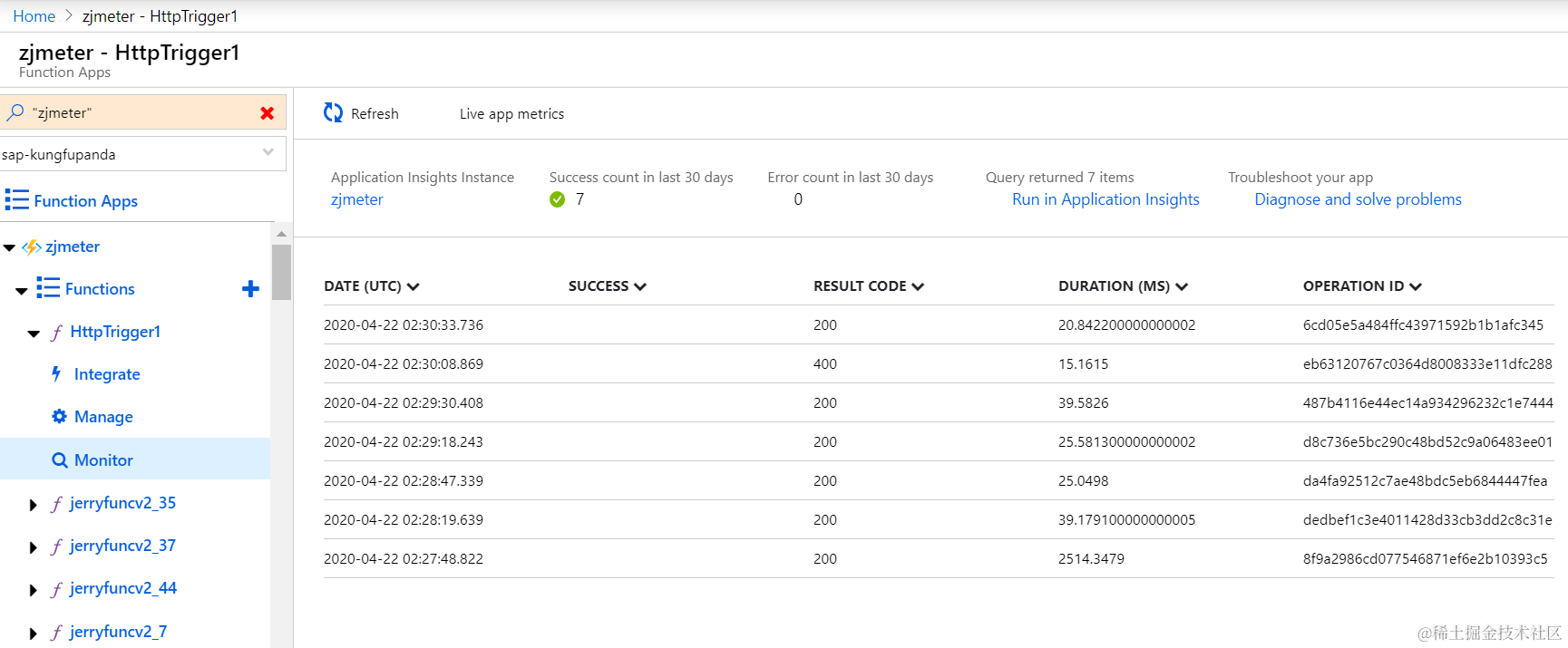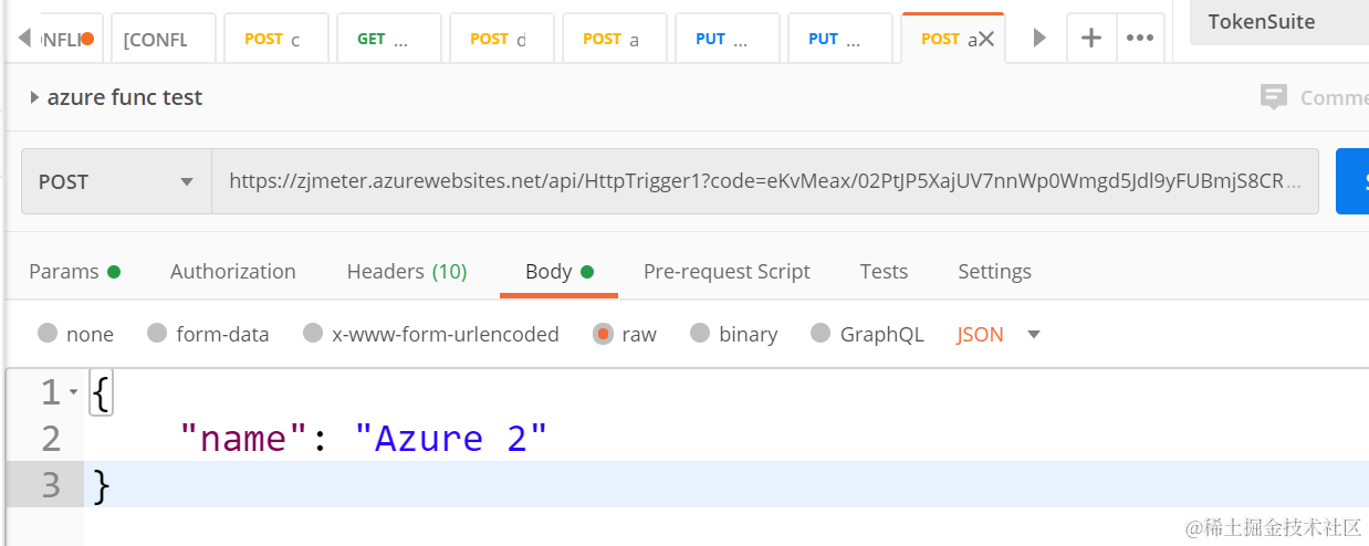 Azure上基于HTTP trigger的Lambda Function 已注销 2021-04-26 57 阅读1分钟 Azure上通过HTTP方式触发的Lambda Function,函数体直接在浏览器里编写: 存储在Azure云端的index.js里: 点击get function url拿到该函数的调用链接,直接通过Postman测试: 在manage面板里能看到调用这个函数需要的access key: monitor里能看到该函数被调用的明细: 要获取更多Jerry的原创文章,请关注公众号"汪子熙":