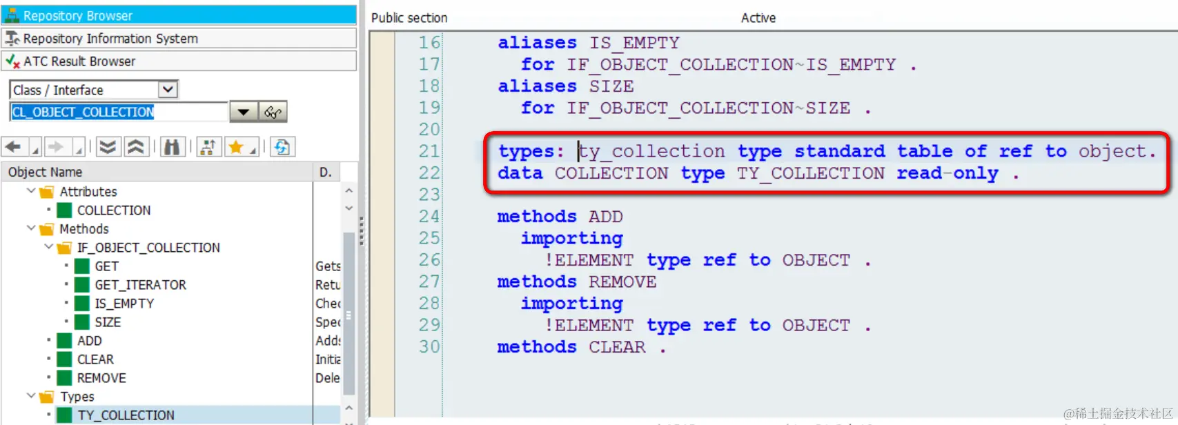 然而这个列表只能插入类型为BOL实例的元素,有更通用的ABAP List工具类么?那就是CL_OBJECT_COLLECTION, 提供了类似Java ArrayList对列表元素的基本操作: