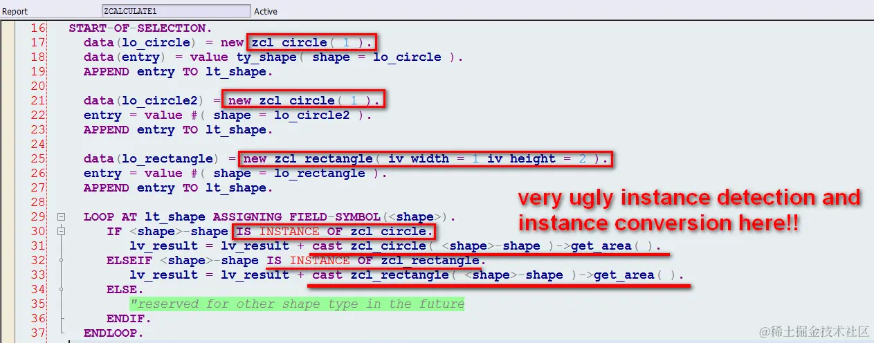 每次创建圆形或者长方形的对象实例之后,添加到内表中,然后LOOP内表,逐行取出元素,用IS INSTANCE OF关键字,判断当前记录指向的是圆形还是长方形实例,再用CAST进行强制类型转换,调用对应的面积计算方法。