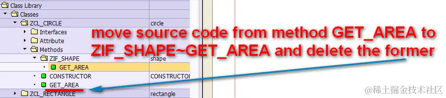 假设我们要开发一个计算图形面积的应用,支持圆形和长方形。实现两个类ZCL_CIRCLE和ZCL_RECTANGLE, 分别按照圆形和长方形的面积计算公式,实现GET_AREA方法。