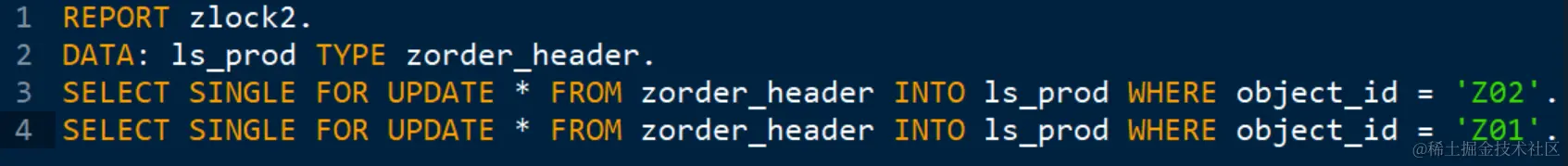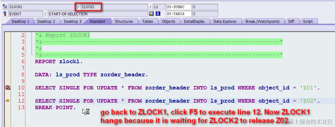 再开发两个ABAP程序ZLOCK1和ZLOCK2,分别按照Z01, Z02和Z02, Z01的顺序使用SELECT SINGLE FOR UPDATE向数据库发起读取请求。