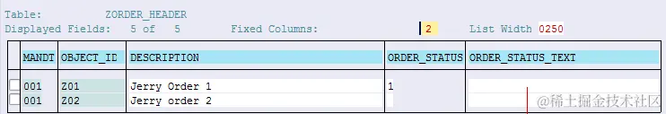 于是我们首先创建一个ABAP数据库表,插入两条记录: