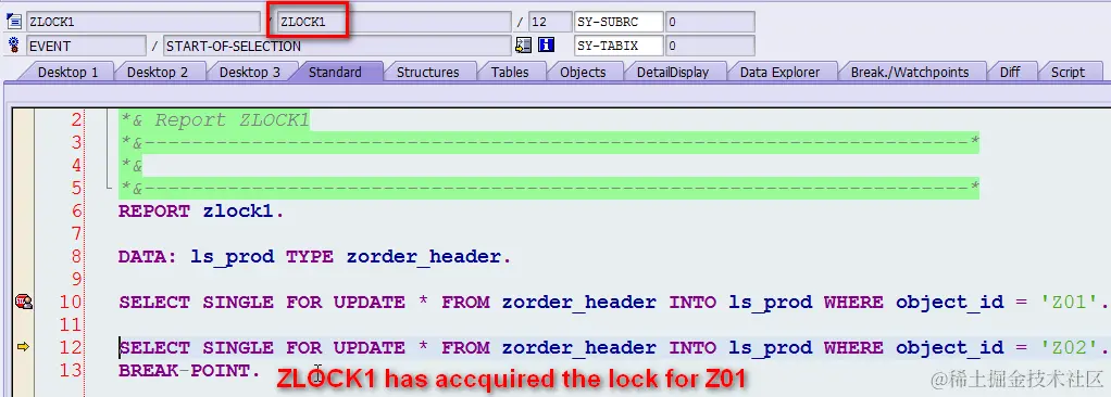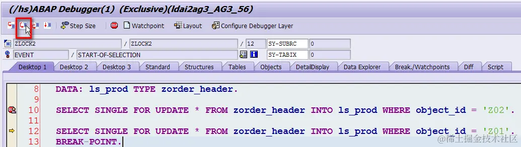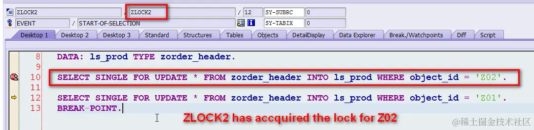 (2) 切换到另一个SAPGUI窗口,执行程序ZLOCK2, 单步调试执行完语句SELECT SINGLE FOR UPDATE … WHERE object_id = ‘Z02’,即此时程序ZLOCK2在数据库层面对Z02成功上锁。