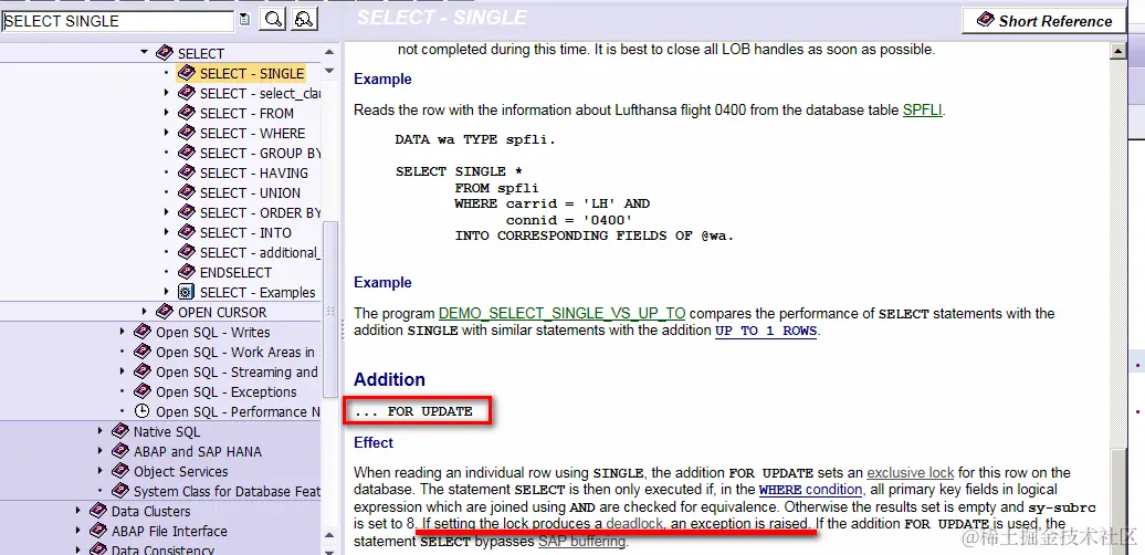 ABAP帮助文档提到,使用SELECT SINGLE FOR UPDATE读取单条记录时,会自动在数据库层面为该条记录设置一把锁(Exclusive lock,有的中文文档翻译成排他锁)。如果上锁操作会导致死锁发生,则会抛出异常。