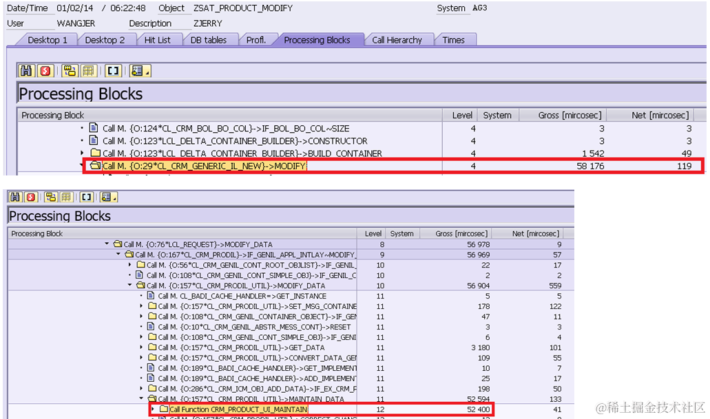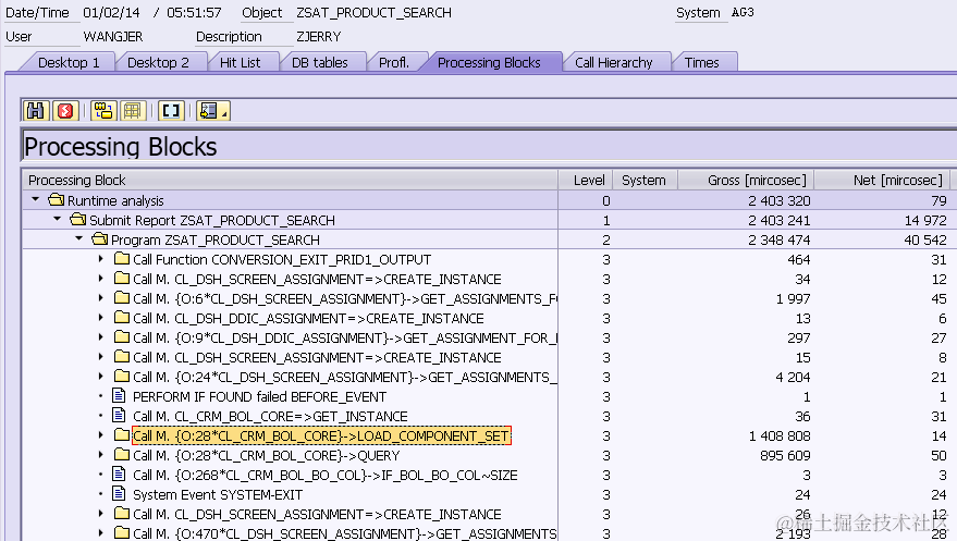From this rough test, we are still not clear about what is the exact performance loss caused by the additional layers in webclient UI compared to ABAP webdynpro. So I plan to SAT to do more accurate performance testing using the following categories. I choose three Genil Models in CRM, the technical name of the model is CRMSM, PROD and BT accordingly. I want to know the percent of execution time spent in BOL & Genil layer compared with the total execution time of Search, Modify and Save. ( Category Modify means the property of a Genil model node is only changed in buffer. The change will not persisted into database until save call is performed ).