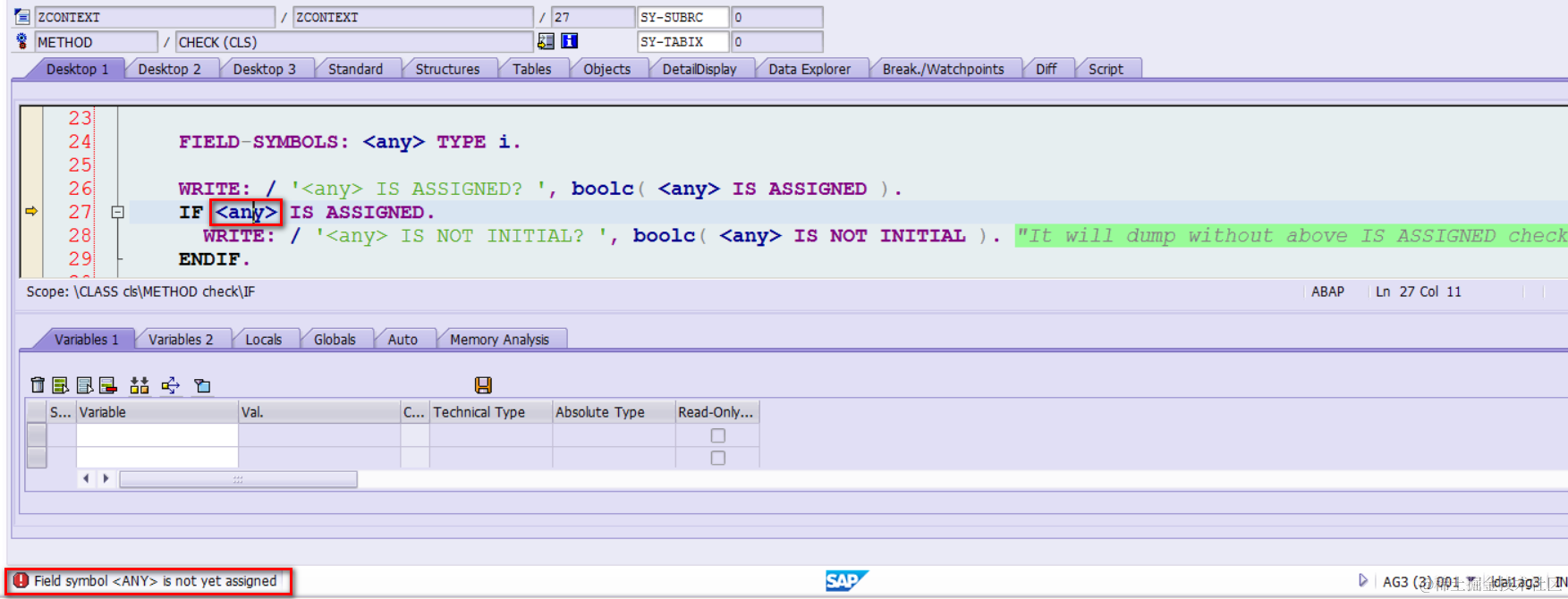 一句话总结,就是:判断引用变量是否有效,用IS BOUND; 判断变量是否处于初始状态,用IS INITIAL; 判断field symbol是否分配有内存区域,用IS ASSIGNED. 在对field symbol进行各种操作之前,先调用IS ASSIGNED进行判断,以避免GETWA_NOT_ASSIGNED错误。