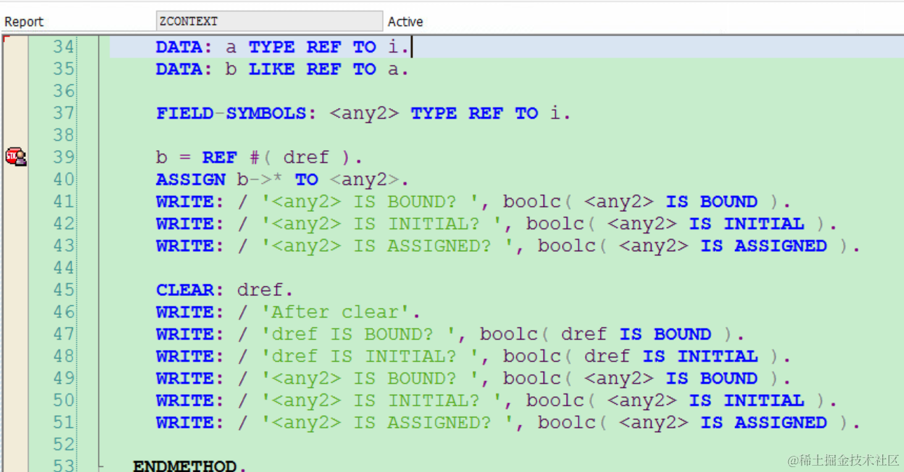 上面代码第37行定义的名为的field symbol,在第45行的CLEAR操作完成之后,就同时满足这三个条件。这个field symbol被分配的内存区域,内容并不是整型数本身,而是一个指向整型变量的引用。