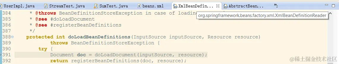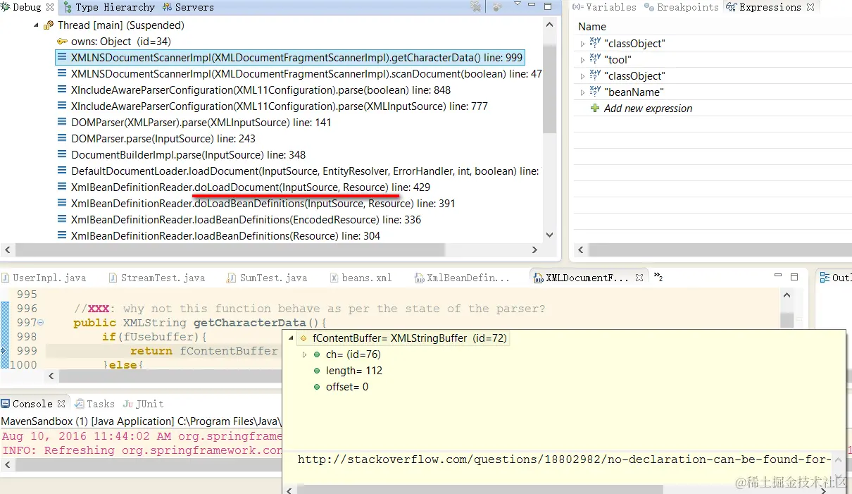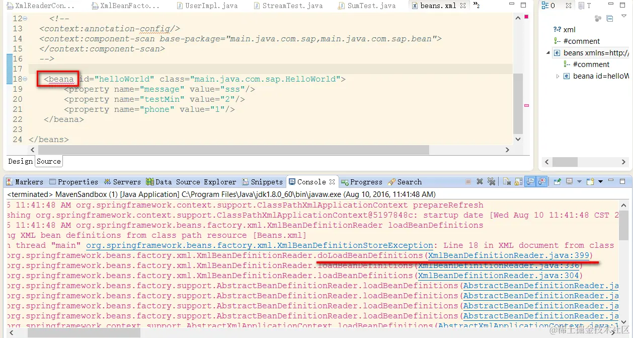 Where can we set breakpoint to start? No hint. Here is a tip: we can make the Beans.xml invalid by deliberately changing te tag bean to beana, and relaunch application. Now exception is raised as expected: Click the hyperlink XmlBeanDefinitionReader.java:399,