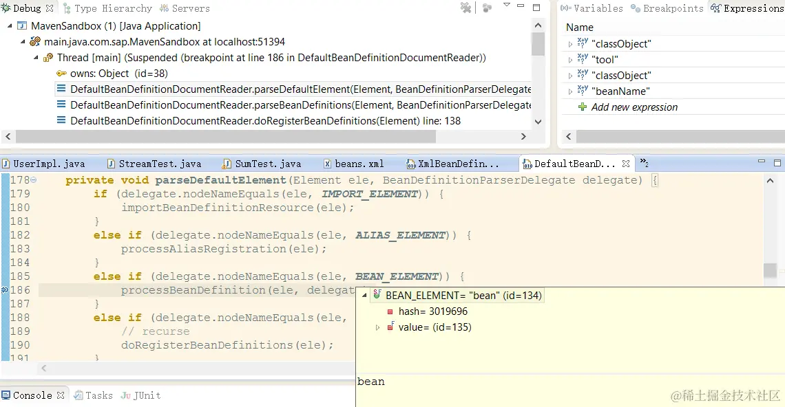 Change the tag from beana back to bean, and start application via debug mode. The code below is the core logic of Bean configuration file parse in Spring framework. The logic consists of two main steps: