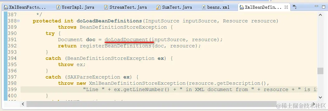 The line 399 where exception is raised will be automatically located. The core logic to load xml file is just near the exception raise position: line 391. So we can set breakpoint in line 391 now: