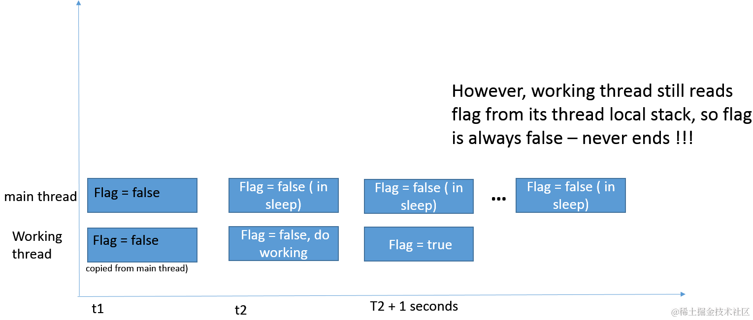 Later, when thread performs modifications on the variable, the change is directly done on thread local stack. And at a given time ( scheduled by JVM, developer has no control about this timeslot), the change will be refreshed from thread local stack to memory. Back to our example, already the main thread has changed the flag to true in one second later ( this is TOO late! ), unfortunately when the working thread reads the flag from its own local stack, the flag is still false ( it makes sense since when it is copied from main memory in main thread ), so the working threads could never end. See the following picture for detail.