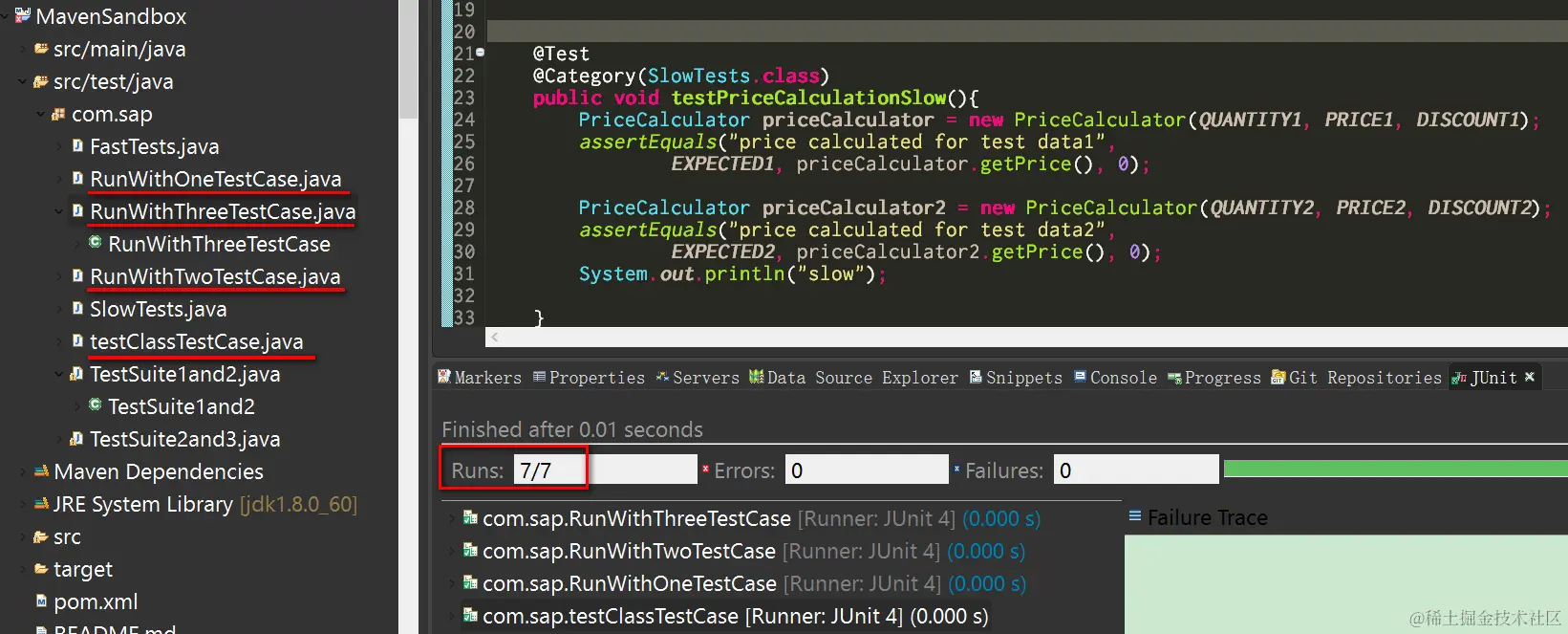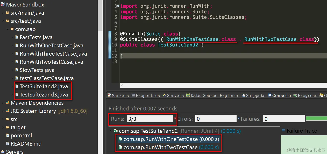 There is another annotation @SuiteClasses which can allows us to categorize test classes into different test suites, and once we specify a given test suite to be executed, all test classes within that suite would be executed one by one.