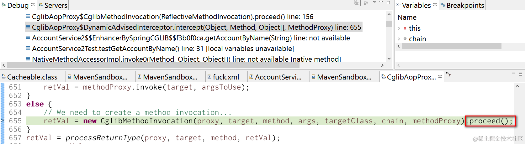 Here in line 31, in debugger we can find that accountService2 is not an instance of application class com.sap.AccountService2, but a dynamic proxy class generated by Spring.