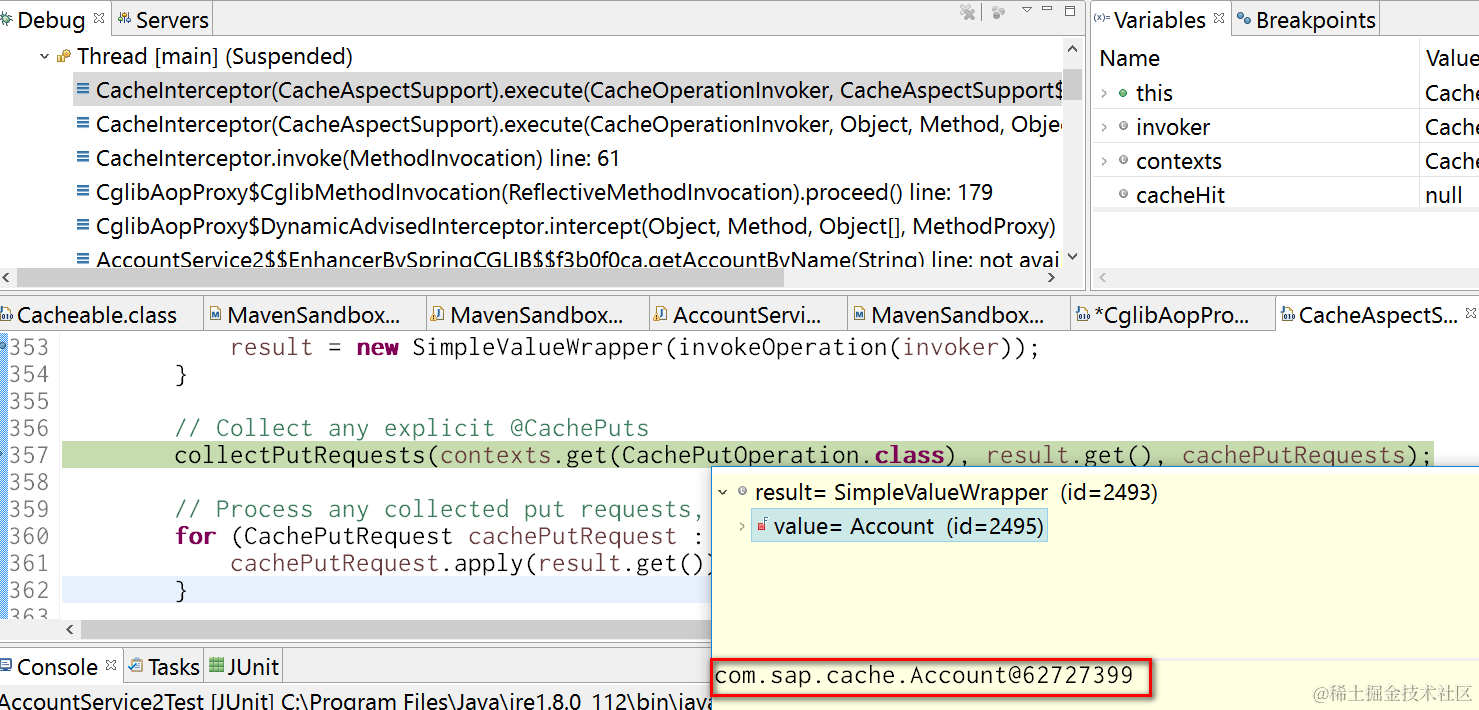 Below is the screenshot for Spring internal cache to store application data, which is based on ConcurrentHashMap. Our cached Account instance with id 2495 could be found there.