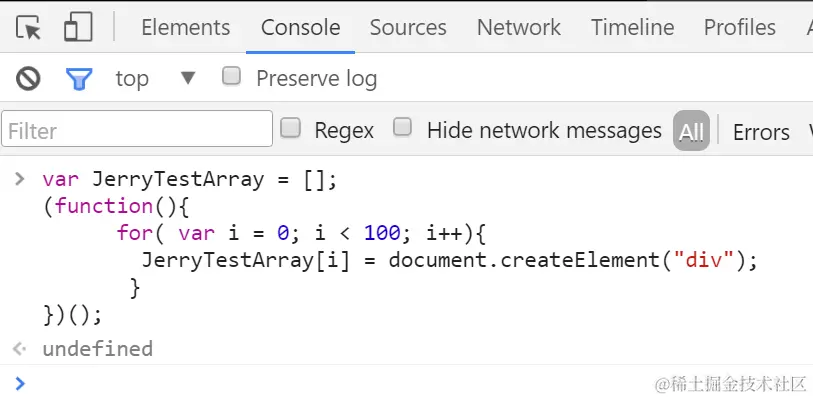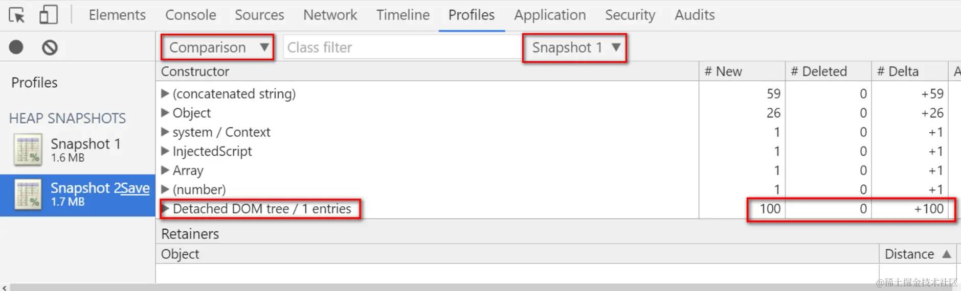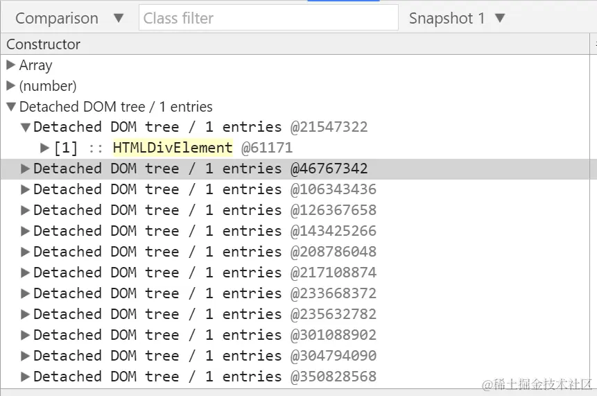 Once done, make the third snapshot and compare it with the second. Now we can find that the re-assignment to JerryTestArray will trigger the destruction of those 100 div nodes by Garbage collector: