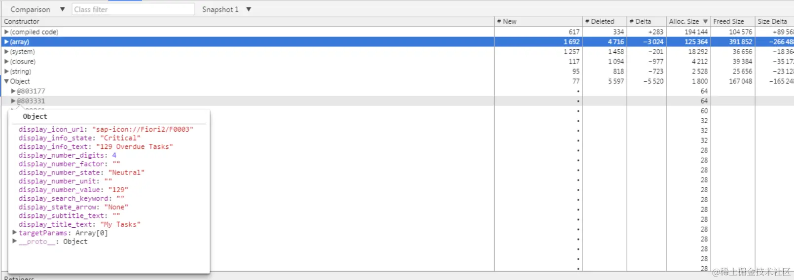 With this gained knowledge now we can check the memory allocation and destruction in some real application. For example click tile “My Tasks” to enter this application, make the first snapshot and click back button within application to return to launchpad, and make the second snapshot and review the comparison result.