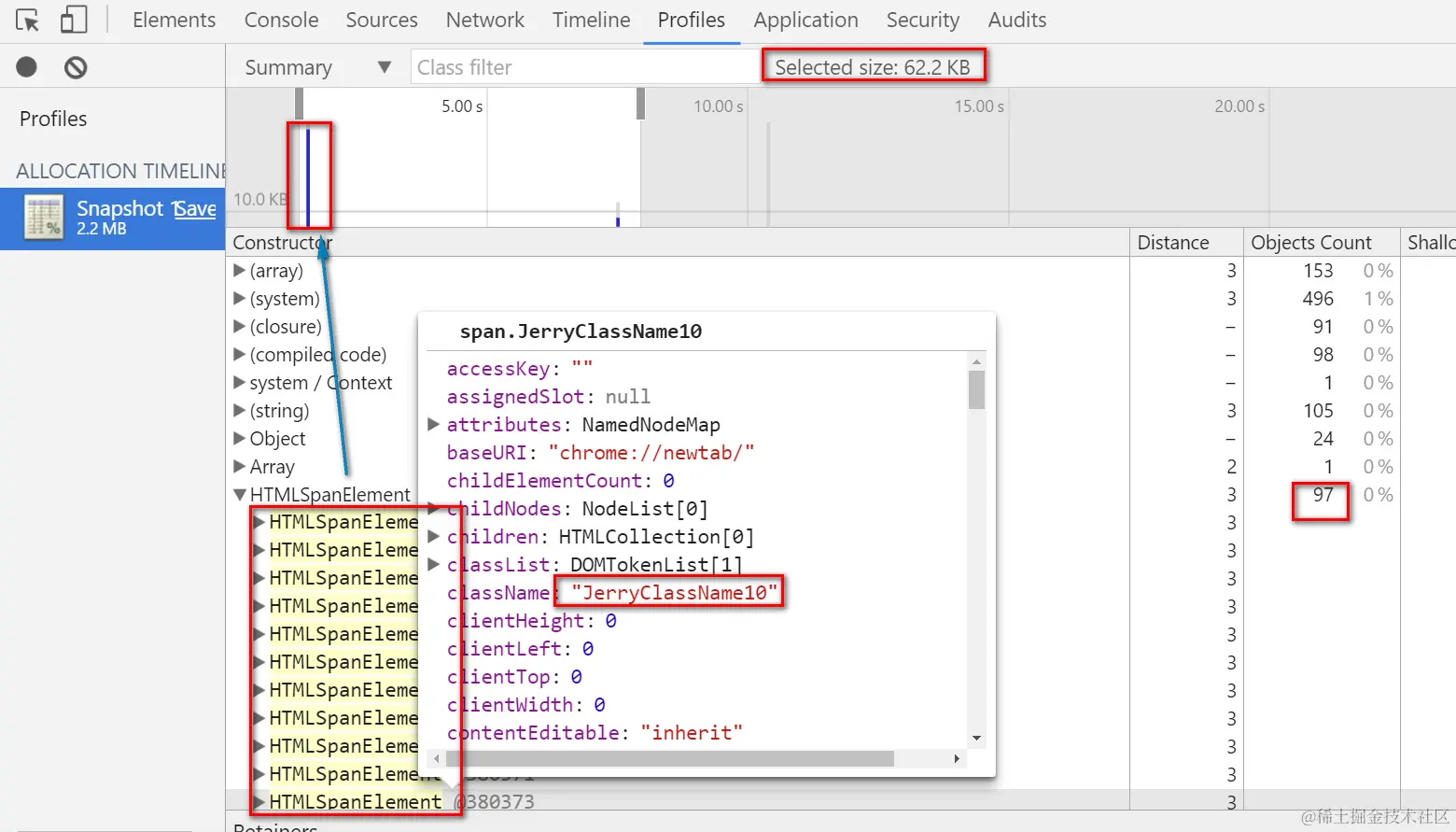 Now stop the profile. The profile is displayed as below. The highlighted vertical blue line indicates the timeslot when the 97 Span elements are created. Note that the number of Span elements displayed here is not 98 but 97 since Chrome development tool displays the final status of objects after “stop profile” button is clicked ( the reference to 30th Span element is replaced by String, so it is recycled by GC ).
