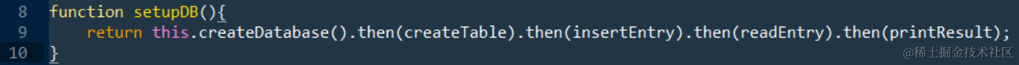 return this.createDatabase().then(createTable).then(insertEntry).then(readEntry).then(printResult);
