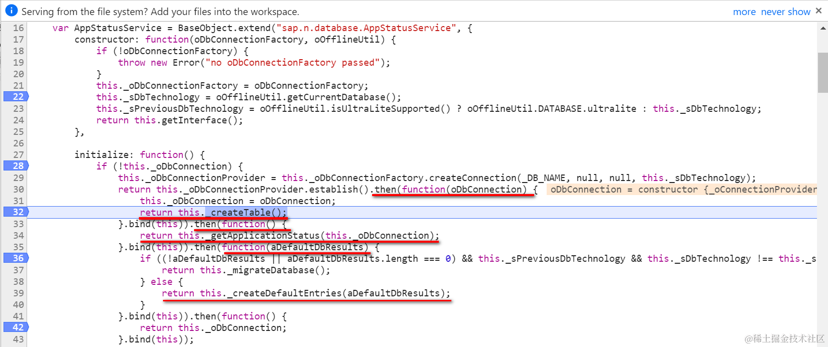 The corresponding database initialization and table read is done by code below in file AppStatusService.js.