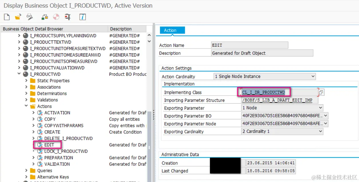 In S/4HANA backend system, launch tcode BOBX to open BO model with name I_PRODUCTWD. Navigate to Edit action and double click, to find implementation class CL_I_DR_PRODUCTWD.