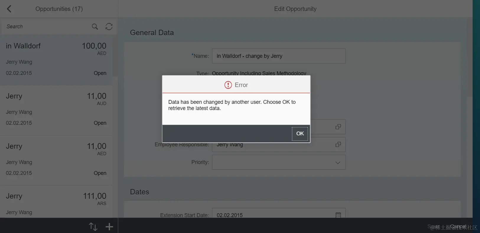 Now say another user has changed this opportunity and saved the change successfully. Jerry was not aware of it at all, he just changed the opportunity, and pressed the Save button.