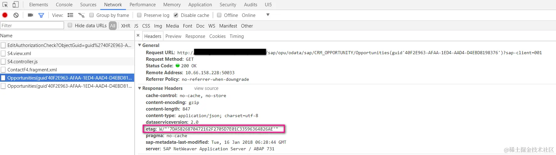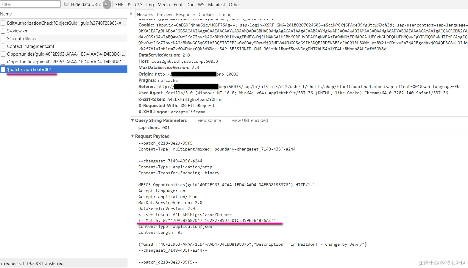 Open Chrome Development Tool again, and we can find that once Jerry has pressed the Save button, a batch request is sent to ABAP backend whose request header contains one field If-Match. This field is filled with the very ETAG value got from the response header field ETAG of the first read request ( which ends up with 26AE ).