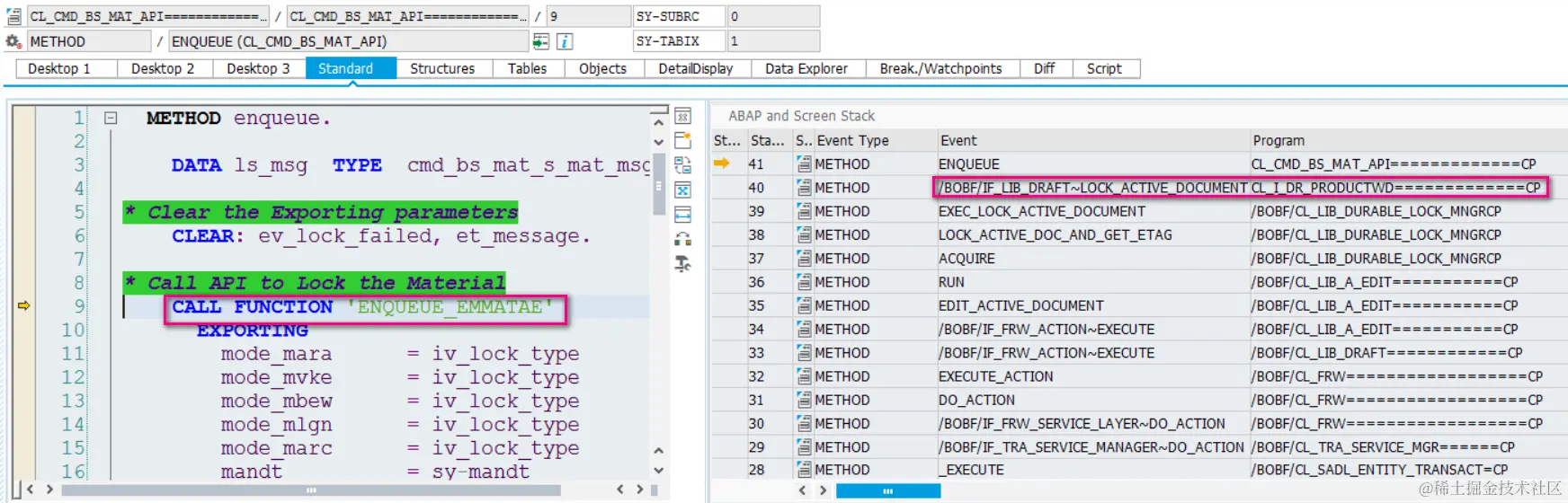 Set a breakpoint on it, click Edit button and breakpoint is triggered. From the callstack we can clearly know how the execution flow is delegated from BOPF framework code to Material application code. The acutal enqueue operation is achieved by the enqueue function module owned by Material application.