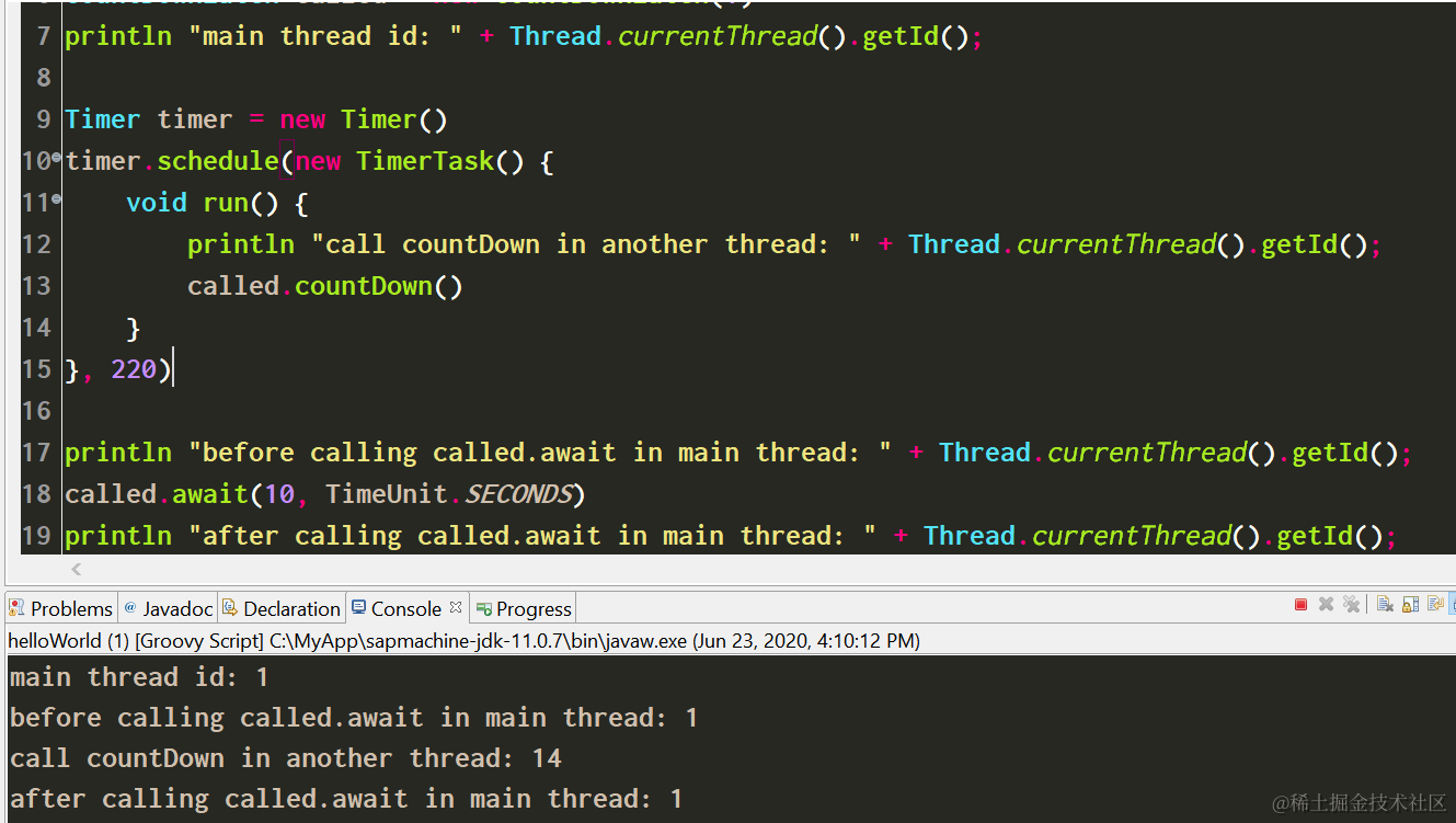 println "before calling called.await in main thread: " + Thread.currentThread().getId();