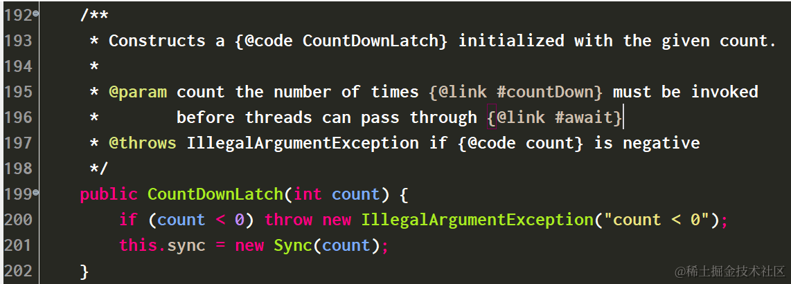 CountDownLatch的构造函数,接收一个类型为整型的参数,代表CountDownLatch所在的线程,在执行await方法后能够返回,所需要在其他线程内调用其countDown方法的次数。