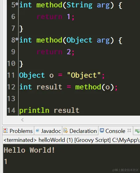 运行时,Groovy根据参数类型决定具体哪一个方法被执行。而Java恰恰相反,被调用的方法根据参数类型,在编译期间就已经定下来了。