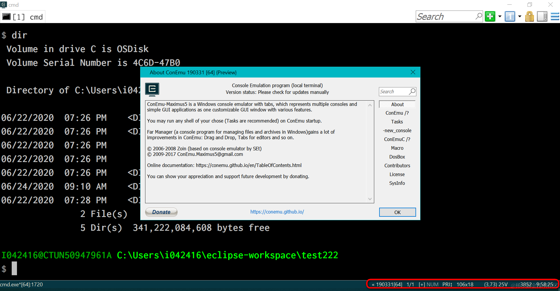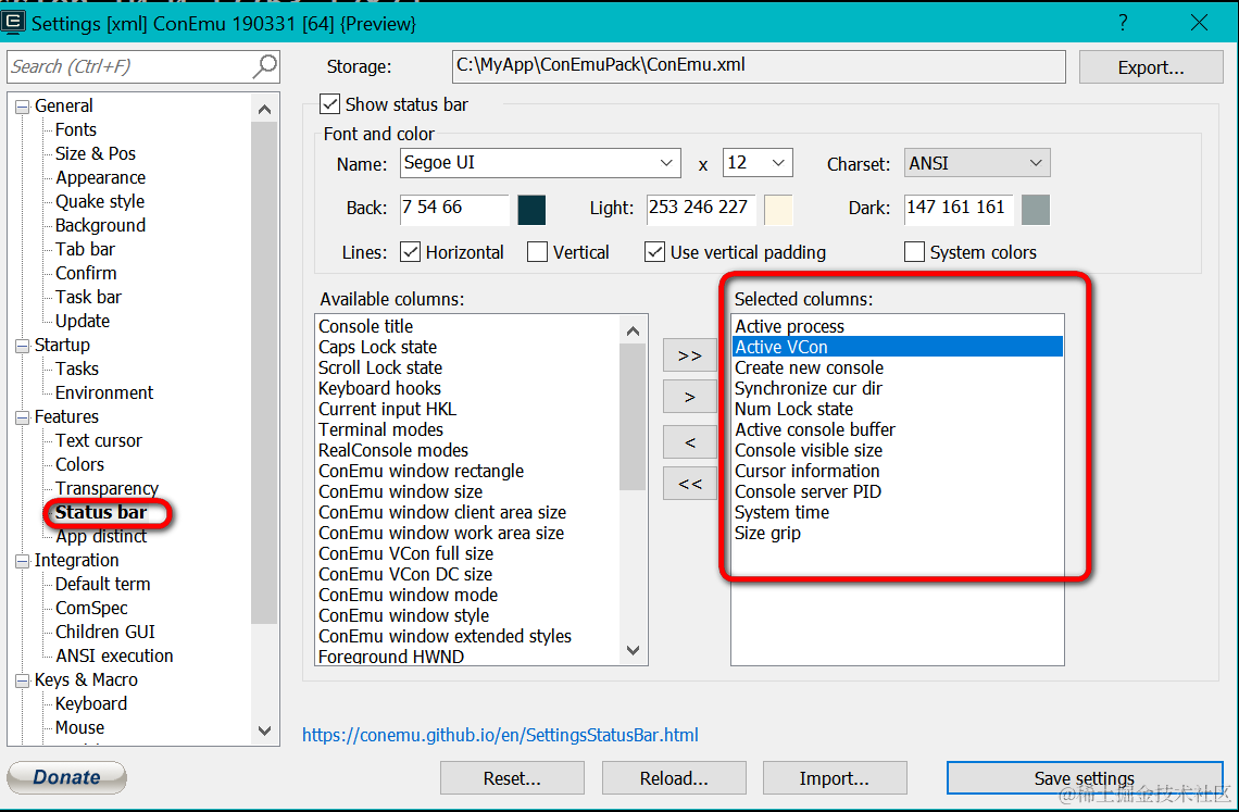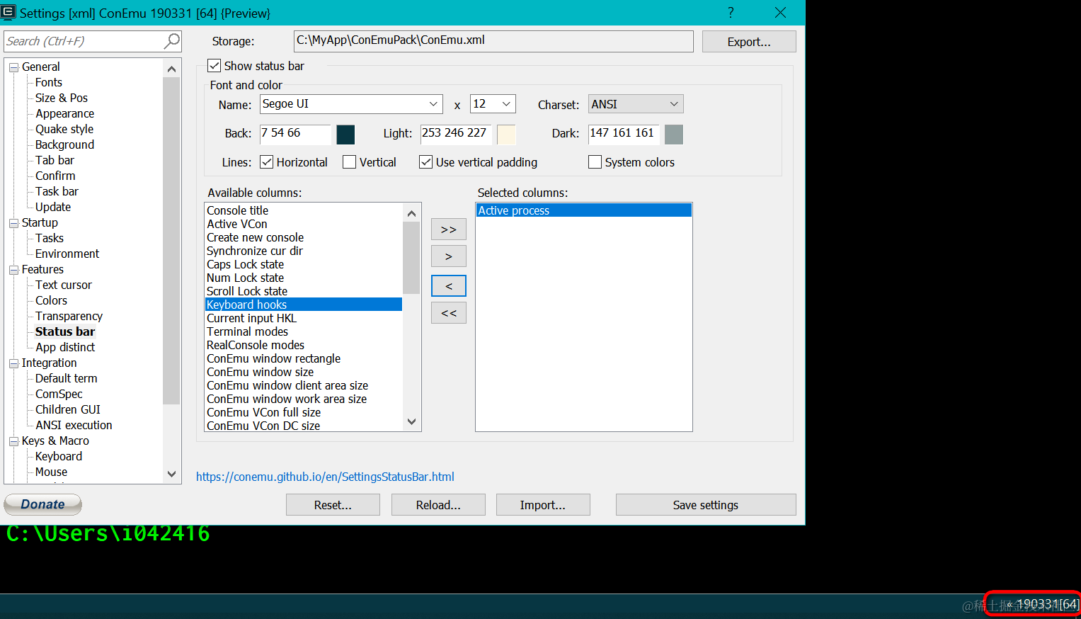 ConEmu状态栏的设置介绍 已注销 2021-04-26 138 阅读1分钟 ConEmu是一个Windows操作系统下命令提示行界面的多面板打开工具。 如上图高亮区域,状态栏显示信息的配置可以在下图设置: 我一般就设置为只显示进程id: 要获取更多Jerry的原创文章,请关注公众号"汪子熙":