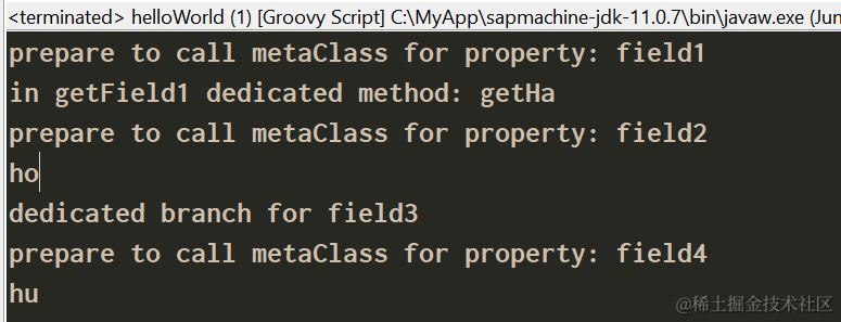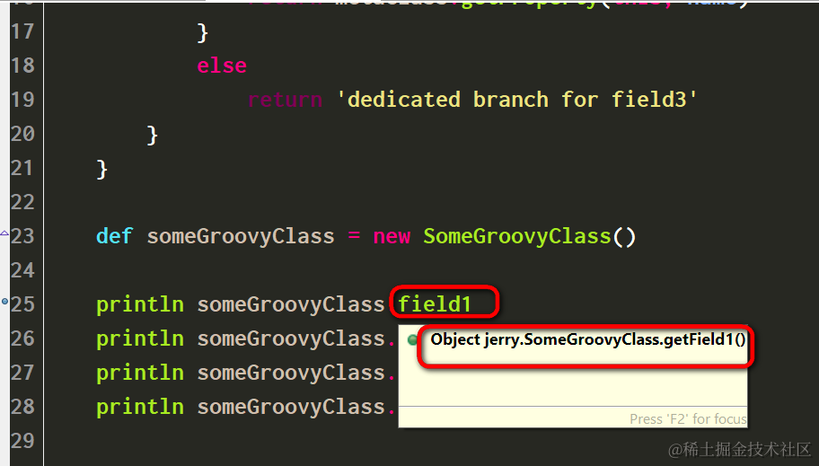 属性field2和field4在POGO里显式定义,而field3同field1不同,其值通过一个override的generic hook方法getProperty返回,这个getProperty原本也定义在接口GroovyObject里: