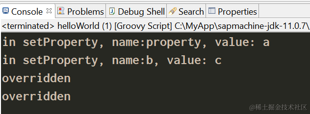 无论本例这个POGO中定义的任何属性被复制时,据被setProperty拦截,值被统一设置为overridden: