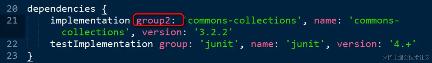 Could not set unknown property ‘group2’ for DefaultExternalModuleDependency{group=‘null’, name=‘commons-collections’, version=‘3.2.2’, configuration=‘default’} of type org.gradle.api.internal.artifacts.dependencies.DefaultExternalModuleDependency.