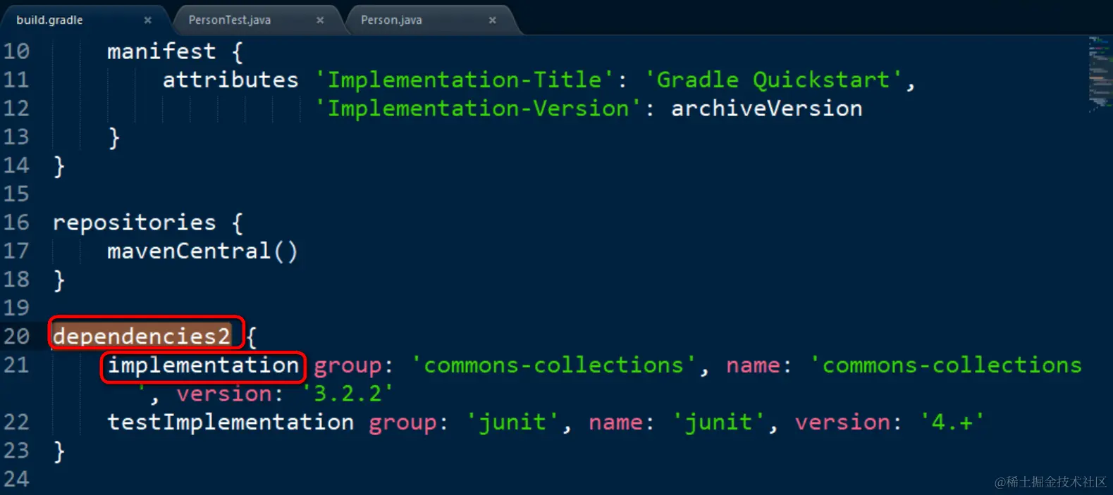 Could not find method dependencies2() for arguments [build_a2307i03s3k13jdug3afl2lin$_run_closure3@21c69f73] on root project ‘quickstart’ of type org.gradle.api.Project.