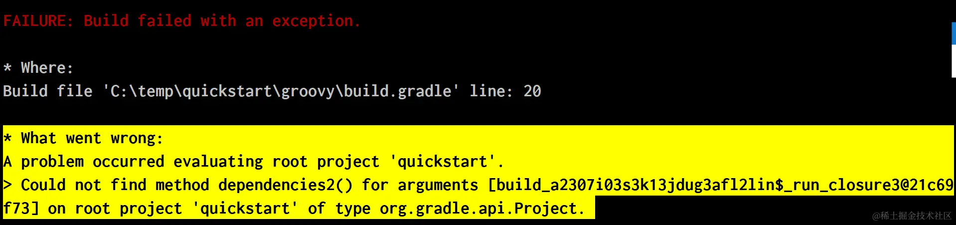 如果把dependencies改成dependencies2, gradle build的输出会遇到错误消息: