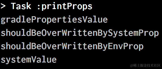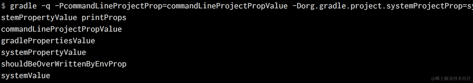 gradle -q -PcommandLineProjectProp=commandLineProjectPropValue -Dorg.gradle.project.systemProjectProp=systemPropertyValue printProps