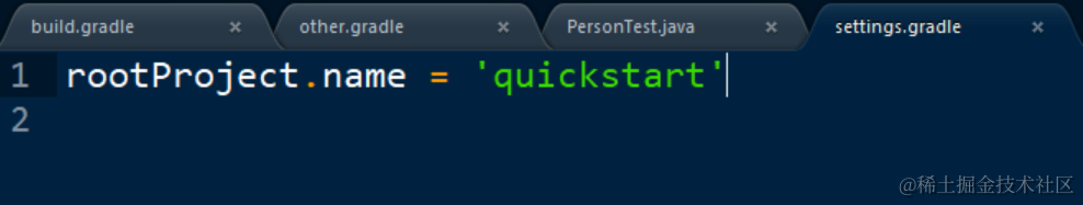 这个’quickstart’是哪里来的呢?other.gradle里使用占位符$project, 而本地文件夹里还有个文件settings.gradle, 里面定义了root project的名称:
