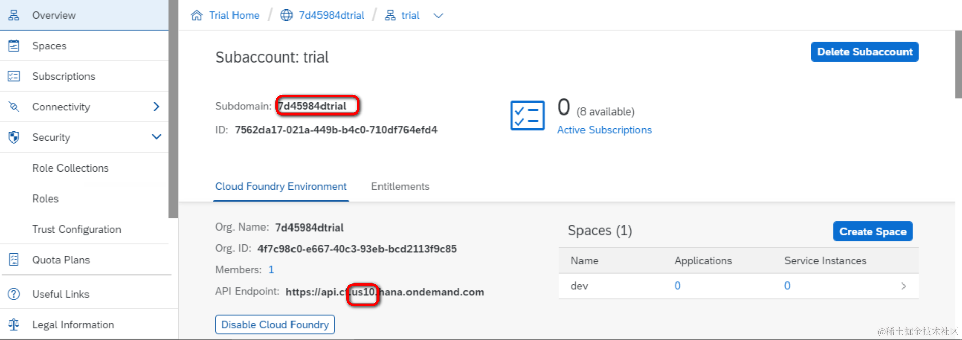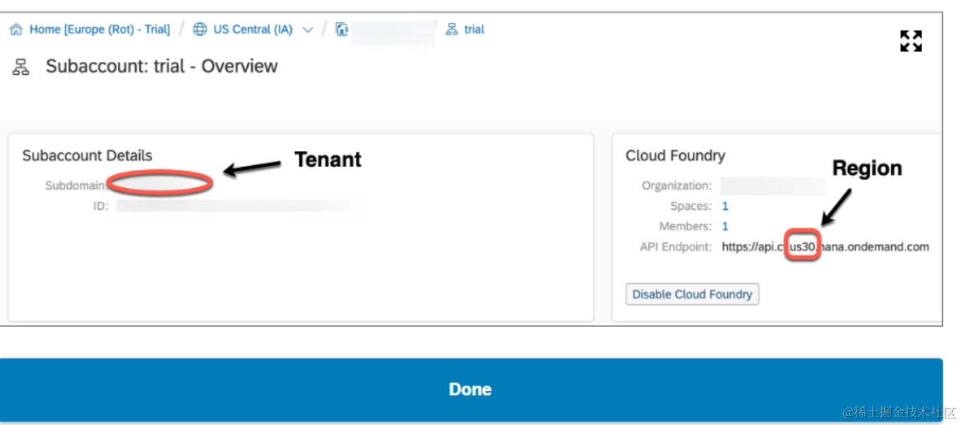 如图,在SAP Cloud Platform的subaccount overview界面,这两个字段的值: