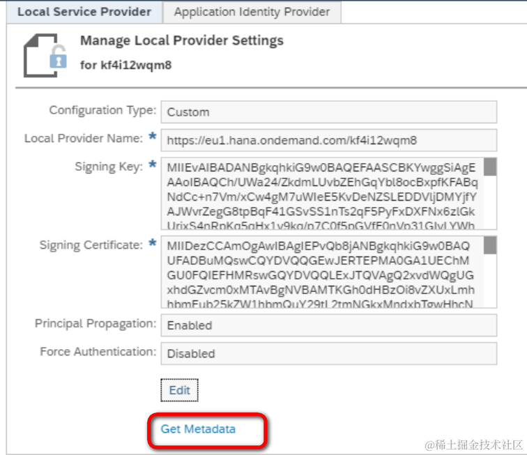 Choose Get Metadata to download the SAML 2.0 metadata describing SAP Cloud Platform as a service provider. You will have to import this metadata into the IdP to configure trust to SAP Cloud Platform.